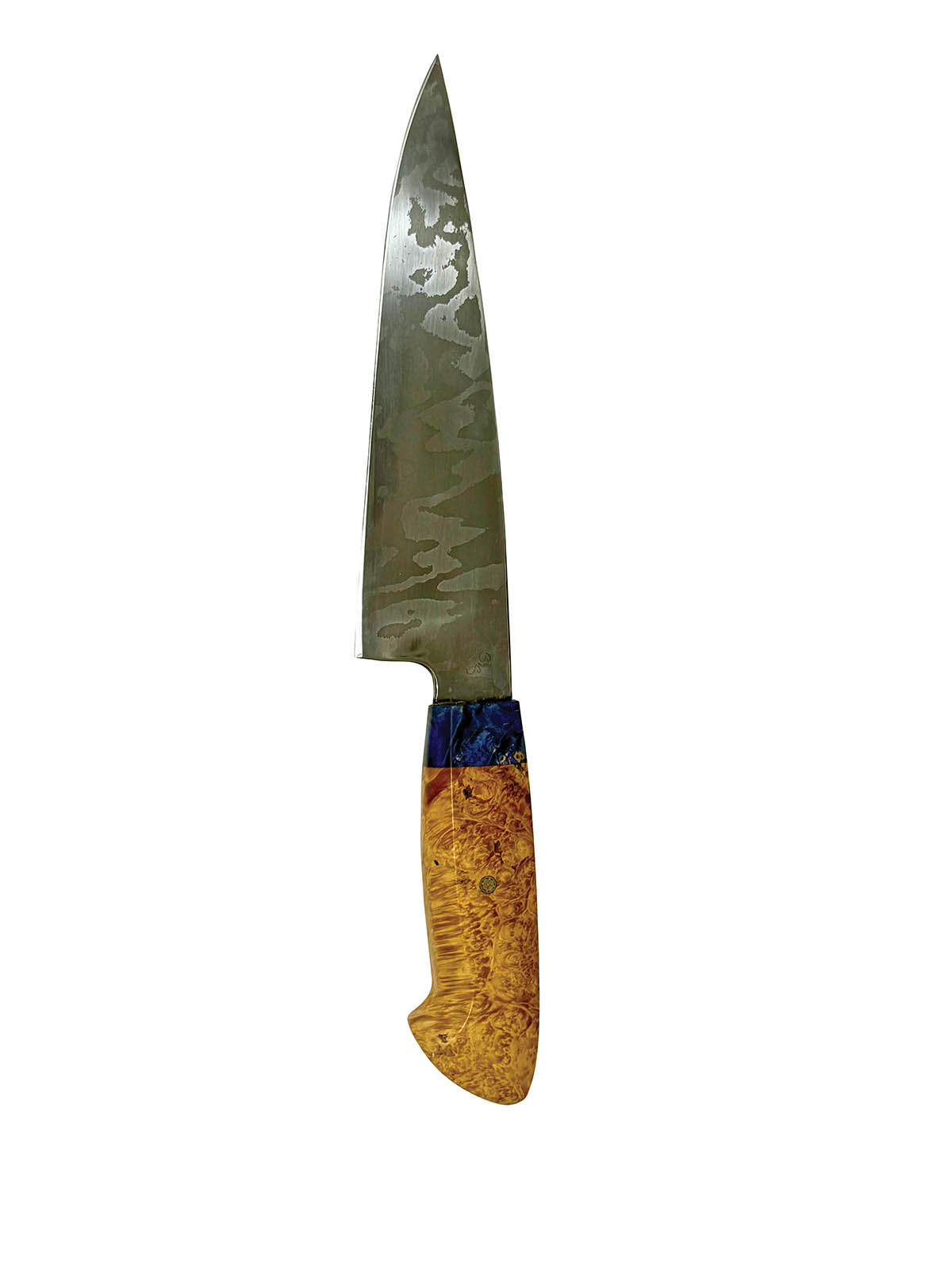 Burls & Steel Damascus chef’s knife, \$900. Preservation Society of Charleston Shop, 147 King St., the-pscshop.com