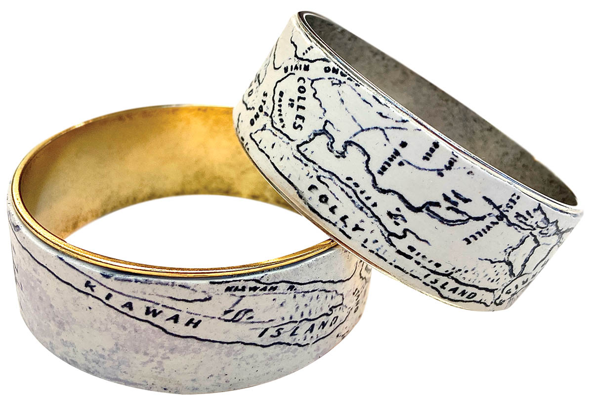 “Historic Charleston” cuff bracelets by Laurie Prophater, \$75 each. Charleston Crafts Gallery, 140 East Bay St., charlestoncraftsgallery.com