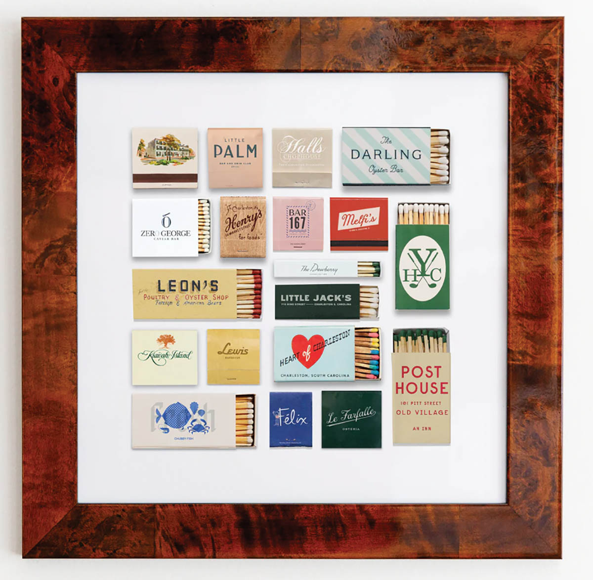 Charleston matchbook collage, \$235 with frame. Match South, matchsouth.com