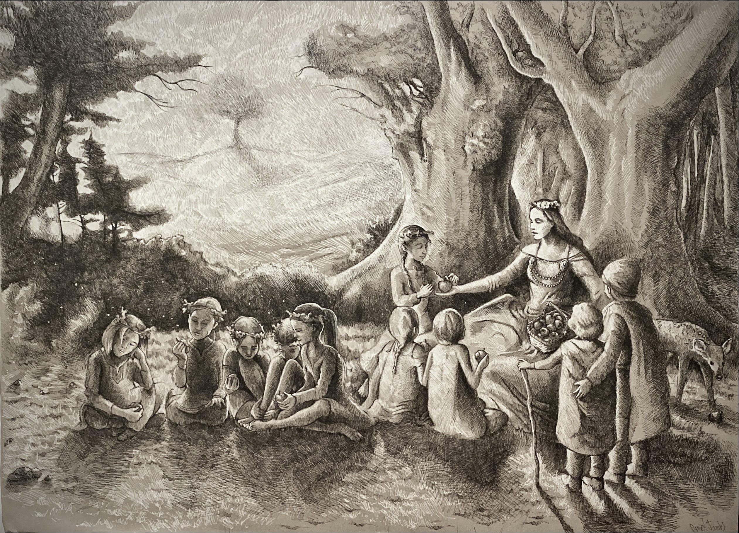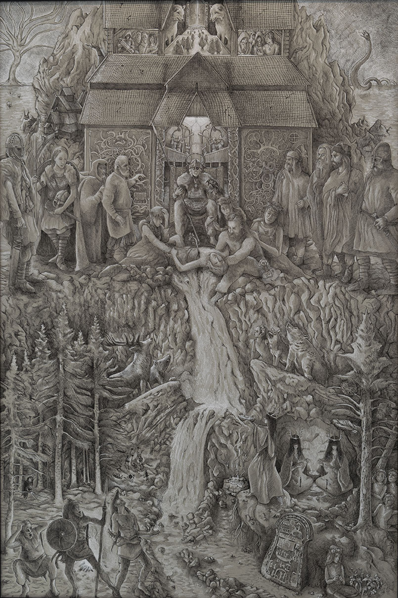 In The Fate of Baldr, Son of Ódin and Frigg, the chief god Ódin’s son lies mortally wounded by a sprig of mistletoe (the only thing that could hurt him) hurled by the blind god Höd. Much like the restless, intricate works of Dutch painter Hieronymus Bosch, there are many more layers of action in Jacobs’s retelling than in the original narrative. Below the dying god, nature seems to be mourning; wolves howl, elk and boar stand at attention, and a crow cries from a pine tree. There’s nearly infinite symbology in Jacobs’s complex works, and none of it is incidental.